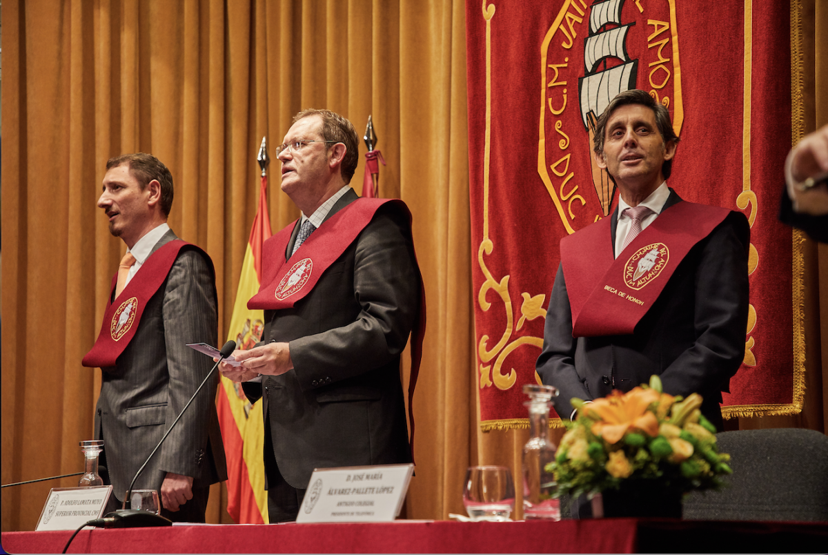 El pasado viernes día 30 de septiembre tuvo lugar el acto académico de inauguración del curso en el CMU Jaime del Amo. La mesa del auditorio fue presidida por el P. Adolfo Lamata, superior provincial, que estuvo acompañado por D. Carlos Pesado, director del centro y por D. José María Álvarez-Pallete López, presidente ejecutivo de Telefónica y antiguo colegial de nuestra institución hace 40 años, que en esa tarde fue distinguido con la Beca de Honor impuesta por su labor incansable en pro de la transformación tecnológica y la innovación.